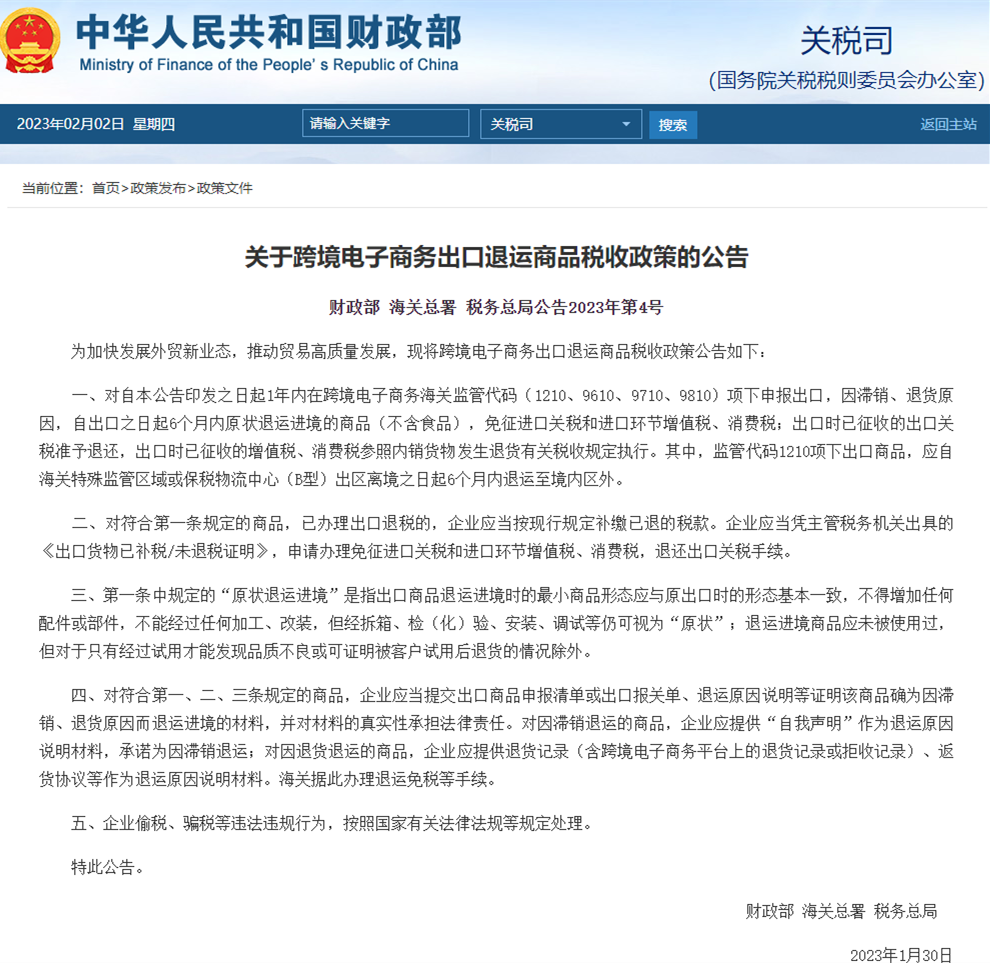 一、对自本公告印发之日起1年内在跨境电子商务海关监管代码(1210、9610、9710、9810)项下申报出口,因滞销、退货原因,自出口之日起6个月内原状退运进境的商品(不含食品),免征进口关税和进口环节增值税、消费税;出口时已征收的出口关税准予退还,出口时已征收的增值税、消费税参照内销货物发生退货有关税收规定执行。其中,监管代码1210项下出口商品,应自海关特殊监管区域或保税物流中心(B型)出区离境之日起6个月内退运至境内区外。