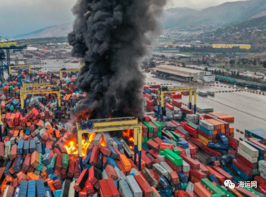 据路透社的目击者和录像显示,周一大地震过后,土耳其位于东地中海沿岸哈塔伊省南部的最大港口伊斯肯德伦港发生集装箱倒塌并引起严重火灾,一缕缕黑烟高高飘向空中。
