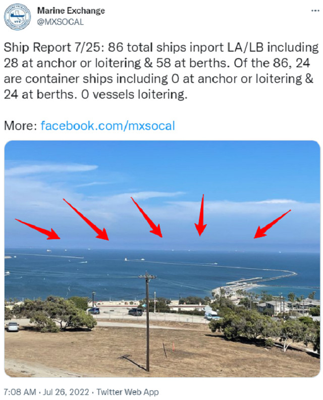 南加州航交所:7月25日洛杉矶港外共有86艘船舶等候。