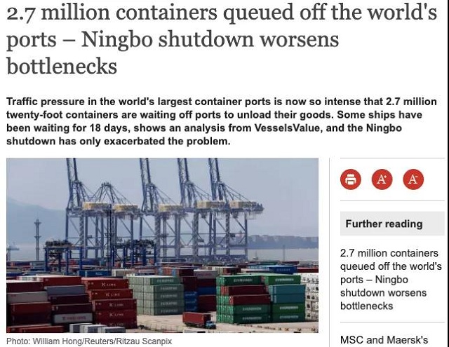 据VesselsValue数据,截至8月18日,共有80艘集装箱船,共计近40万个集装箱在宁波港其他码头等待装卸货物,最长的排队时间超过了9天。此次梅山码头关闭导致货物延误、船舶改道,产生的连锁反应已经影响到全球其它港口,加剧了全球供应链混乱。目前全球有约270万个集装箱在各大港口等待卸货,美国长滩港最长等待时间超过了18天。
