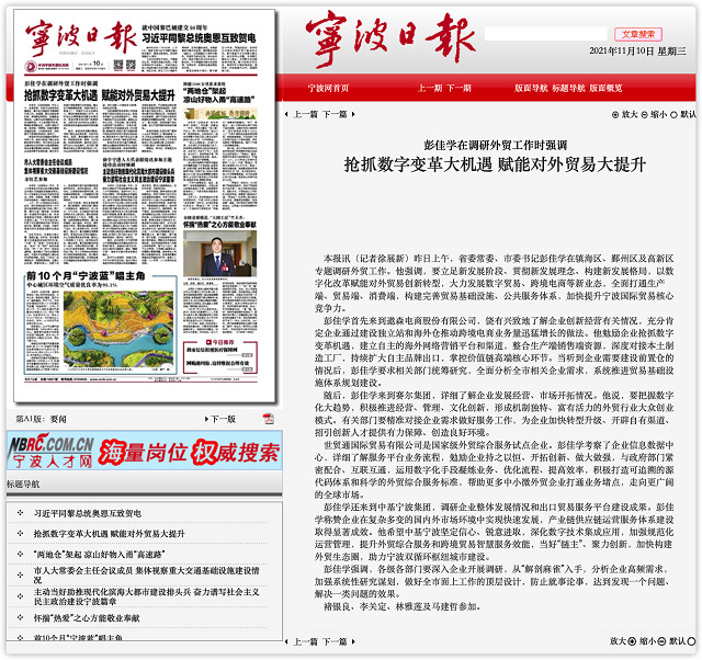 本报讯(记者徐展新)昨日上午,省委常委、市委书记彭佳学在镇海区、鄞州区及高新区专题调研外贸工作。他强调,要立足新发展阶段、贯彻新发展理念、构建新发展格局,以数字化改革赋能对外贸易创新转型,大力发展数字贸易、跨境电商等新业态,全面打通生产端、贸易端、消费端,构建完善贸易基础设施、公共服务体系,加快提升宁波国际贸易核心竞争力。
