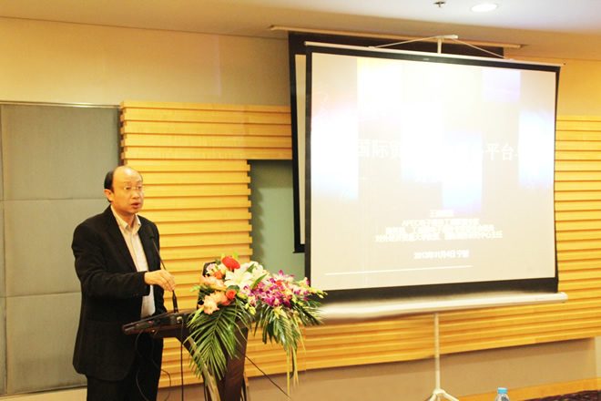此次研讨会由宁波市对外经济贸易企业协会王海生副会长主持。首先,由商务部中国服务贸易协会专家委员会副主任、浙江大学电子服务研究中心主任陈德人教授就“电子商务发展新趋势”作了主题发言。陈教授详细阐述了电子商务发展的四次浪潮及其特征,并表示服务业是中国经济转型升级的突破口。接下来,由对外经济贸易大学、国际商务研究中心主任王健教授就“国际贸易综合服务平台与外贸转型升级”作了主题发言。王健教授详细分析和对比了跨境电子商务的两个路径(线上与线下交易)及三个环节(交易前、交易中、交易后),并表明国际贸易综合服务平台及其模式的创新不仅为中小企业进入国际市场提供便利,还能延续中国制造的优势,带动其他服务业发展,以确立新型的国际贸易综合服务行业。