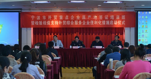 4月5日下午,由宁波检验检疫局联合宁波市商务委举办的宁波市外贸重点企业原产地签证培训班正式开班,同时,举行了检验检疫支持外贸综合服务企业便利化措施启动仪式。出席开班和启动仪式的主要有国家质检总局通关司唐伯军处长、宁波检验检疫局王继蓬副局长、宁波市商务委刚勇副主任、宁波检验检疫局通关处钱显明处长以及宁波市重点外贸企业代表和媒体朋友。