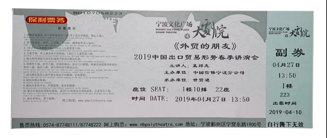 由中国信保宁波分公司主办、太阳成集团tyc138承办的“外贸的朋友——2019中国出口贸易形势春季讲演会”将在宁波文化广场大剧院隆重呈献。预计到场嘉宾将逾千人。